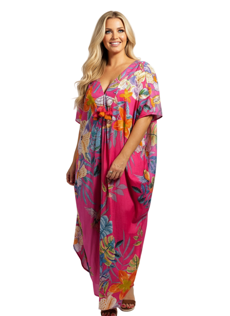 This maxi-length V-neck kaftan showcases a lively pink and coral pattern with beautiful birds and floral motifs on soft, 100% cotton fabric, providing breathable comfort. Crafted in a generous free size (XXL), it delivers a comfortable, relaxed fit that flatters a range of body types. The addition of decorative tassels enhances its sophisticated appeal, making it a refined option for effortless, stylish dressing.