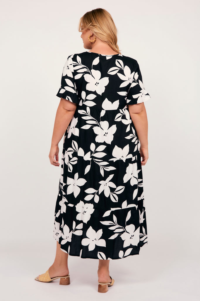 The Sabrina Maxi Dress Night Bloom offers effortless elegance with its tiered design and flattering empire waist. Crafted from 100% rayon, it features a relaxed V-neckline and short sleeves finished with delicate frill cuffs for a refined touch. Practical pockets enhance its functionality, while the black background with white floral print adds classic charm. Designed in Brisbane, Australia, this dress combines comfort and style for versatile wear.