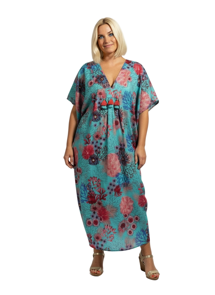 This maxi-length V-neck kaftan features a vibrant turquoise, pink, and coral print on soft, pure cotton fabric, ensuring breathable comfort. Designed as a generous free size (XXL), it offers an easy, relaxed fit suitable for various body shapes. Decorative tassels add a refined touch, making it an elegant choice for stylish, effortless wear.