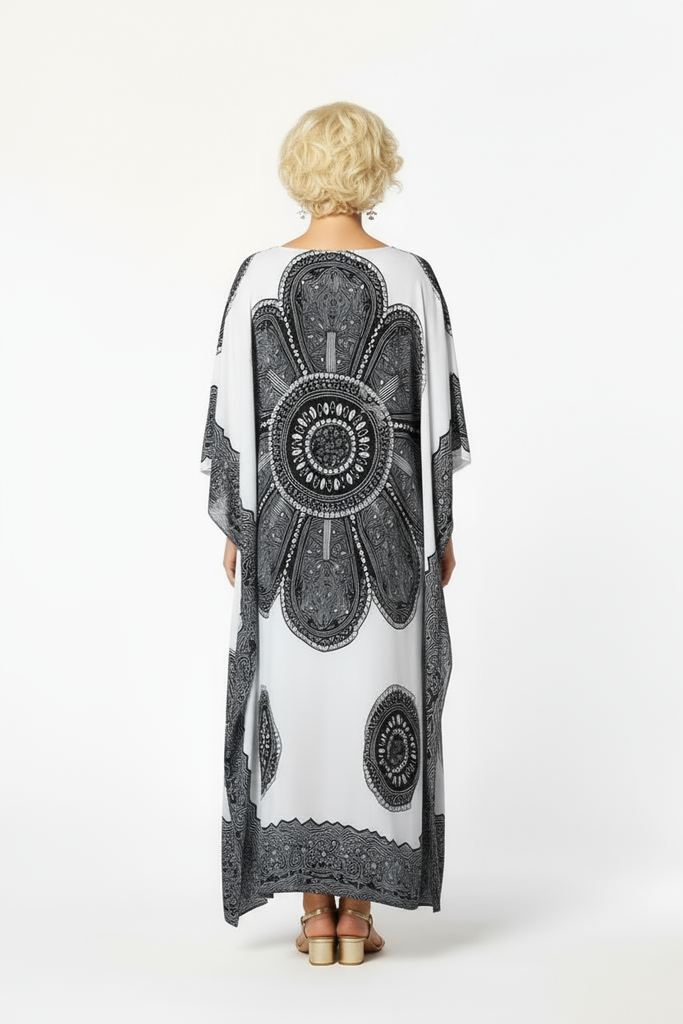 With 25 years of expertise in perfecting long kaftans, this brand offers one of the most affordable, premium options available. Crafted from 100% rayon, the kaftan is naturally breathable and luxuriously soft. Featuring a simple front v-neck and a true free-size design that accommodates sizes 10 through 26, it provides a comfortable fit for virtually everyone. The “Bling” is highlighted by meticulously hand-sewn sequins that add a touch of elegance. The kaftan measures 90cm in width and approximately 120cm in length.