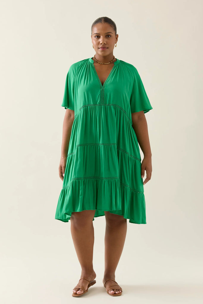 Designed with thoughtful tiers, subtle trim, and a flattering A-line shape, this dress flows easily from coffee dates to beachside lunches. The midi length is both flattering and perfect for warm summer days - comfortable, stylish, and easy to wear.