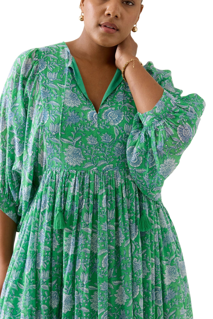 The Wilma Dress is crafted from lightweight cotton voile, hand screen printed for a one-of-a-kind look. Inspired by floral hand-block, and featuring a V-neckline with tassel ties, a gathered waist, 3/4 sleeves. Fully lined for comfort and ready to wear.