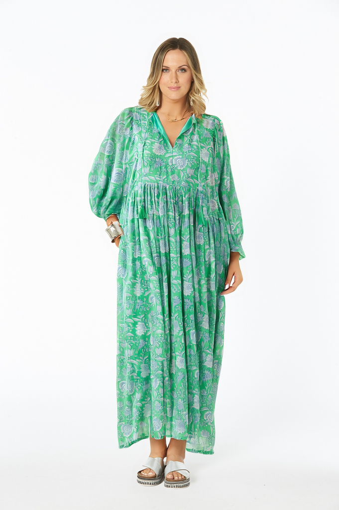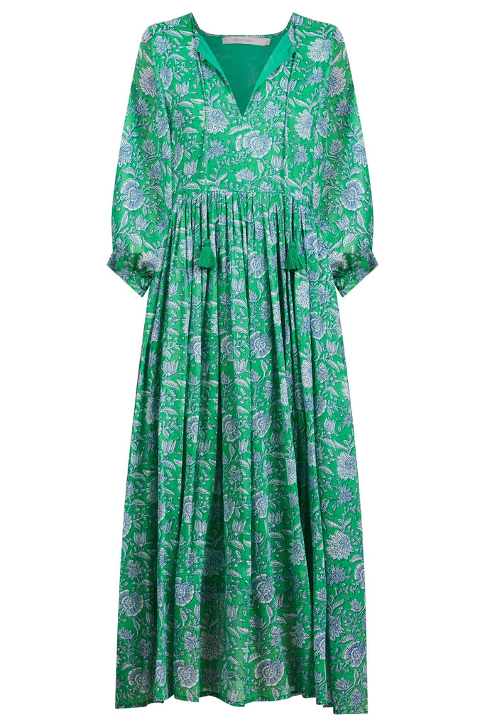 Made from lightweight, hand screen-printed cotton voile, the Wilma Maxi brings softness and ease to your summer wardrobe. Inspired by floral hand-block and featuring a V-neckline, tassel ties, gathered waist and full-length hem. Fully lined for comfort and ready to wear.