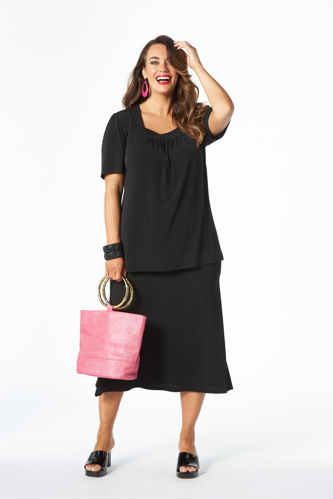 This classic skirt is expertly crafted with a bias cut that ensures a flattering, fluid drape. The elasticized waistband, fully covered with fabric, provides a secure yet comfortable fit, allowing for ease of movement throughout the day. Measuring 34¼" (87 cm) in length, it offers versatile coverage suitable for various occasions. Made from our Polyester and Spandex blend, the fabric combines stretch with resilience, maintaining shape while delivering lasting comfort. This skirt is an essential wardrobe piece that balances timeless style with practical wearability.