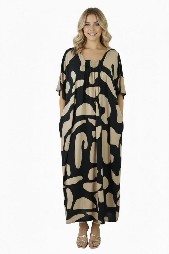 Introducing the Bermuda Kaftan in our "Abstract Geo" print. This is a long, plus size kaftan featuring front shirring, side pockets and splits.