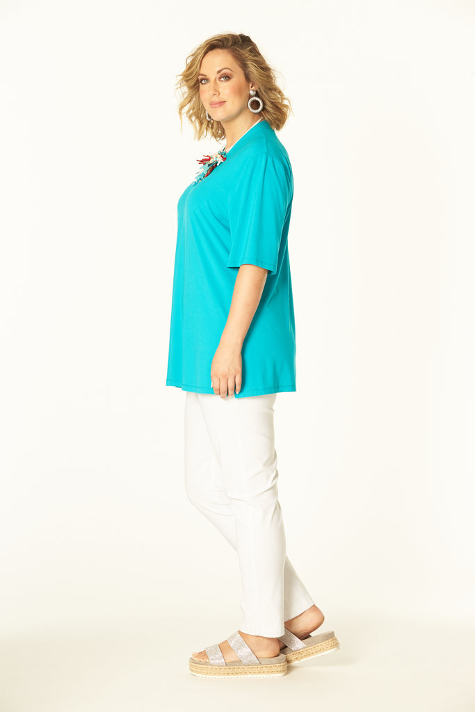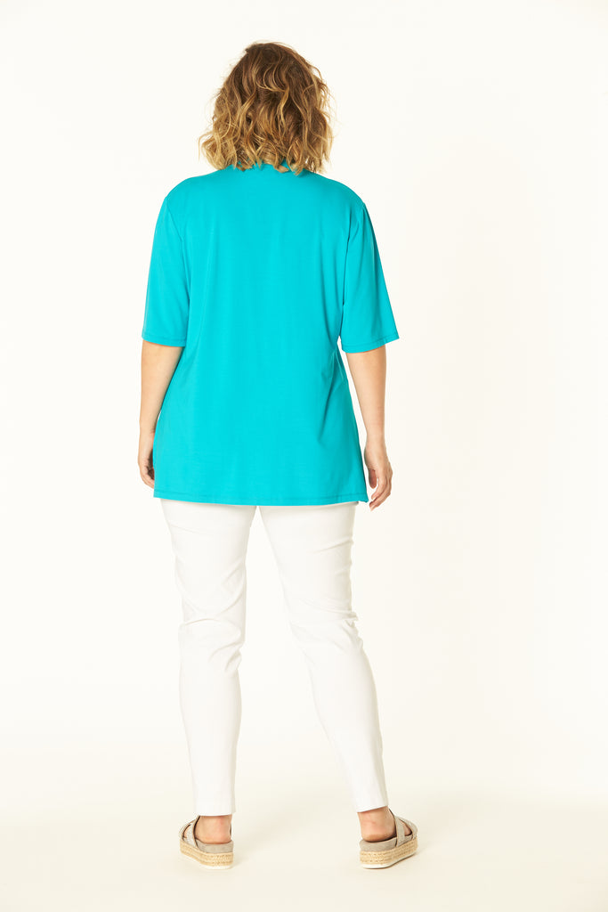 This turquoise vee neck top is crafted from a comfortable polyester and spandex blend, designed with a front stitched pleat and short sleeves for a refined look. Measuring 31 inches (79 cm) in length, it offers versatile styling options that work seamlessly with both pants and skirts.