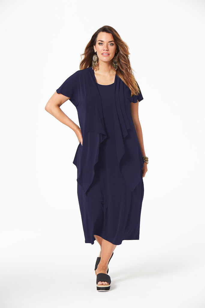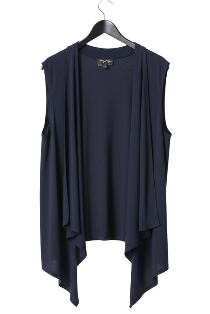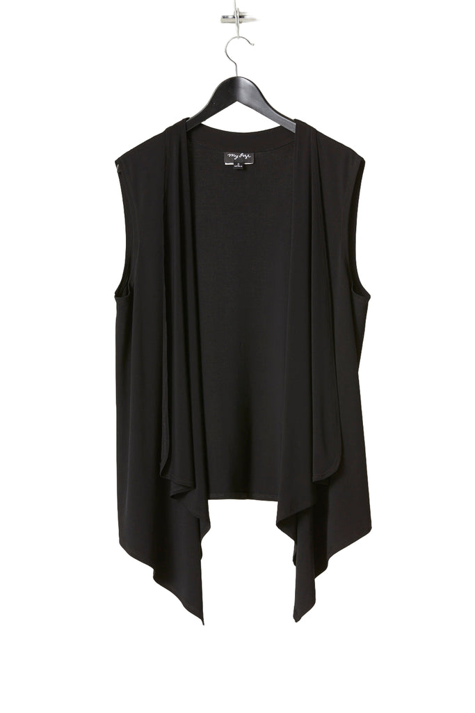 This versatile layering piece is perfect for enhancing your outfit, whether worn over a dress, singlet, or tee, offering extra coverage with a fashionable layered look. The classic cap sleeve vest showcases a waterfall front design. The garment length extends to 34" (87cm) and is crafted from a polyester/spandex blend. Available in black and sizes S to XL.