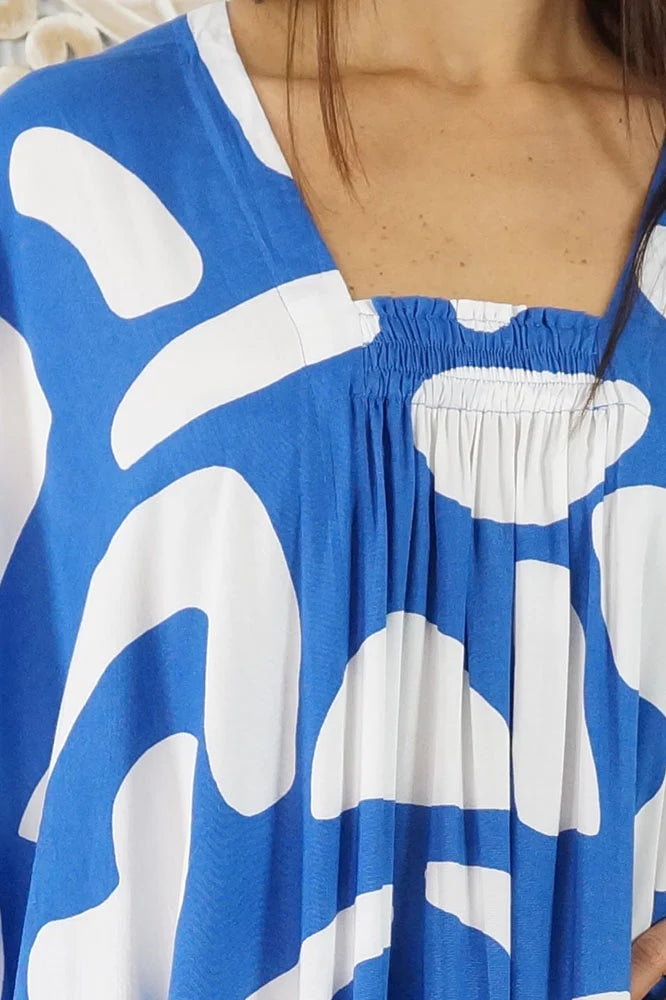 Introducing the Bermuda Kaftan in our "Abstract Geo" print. This is a long, plus size kaftan featuring front shirring, side pockets and splits.