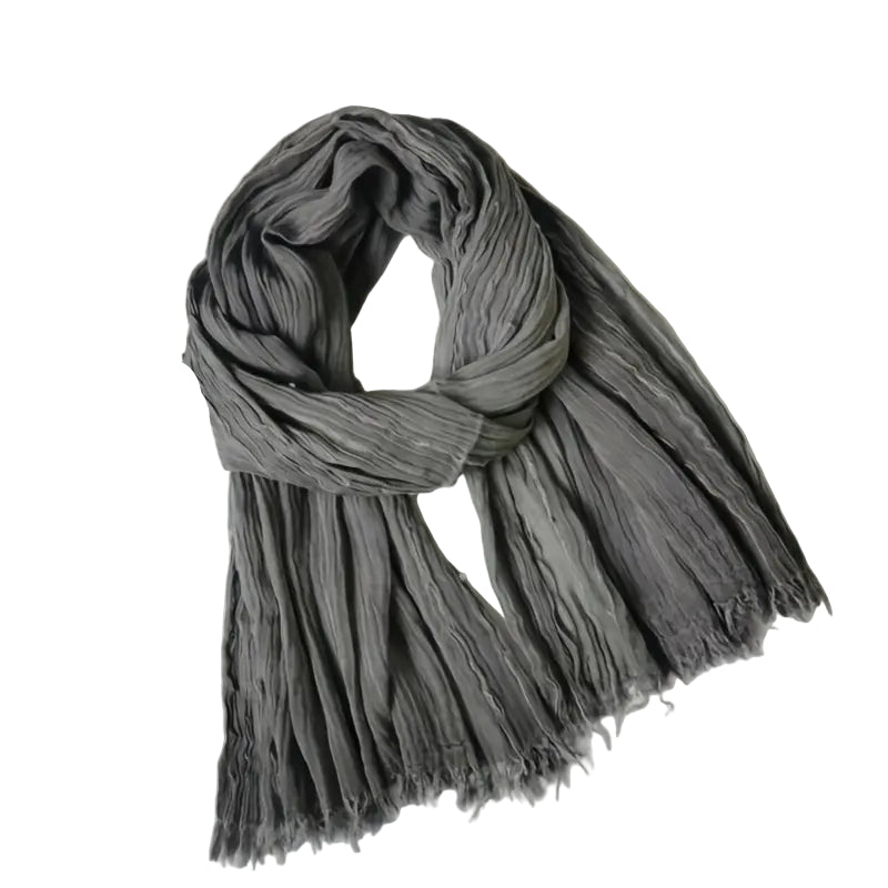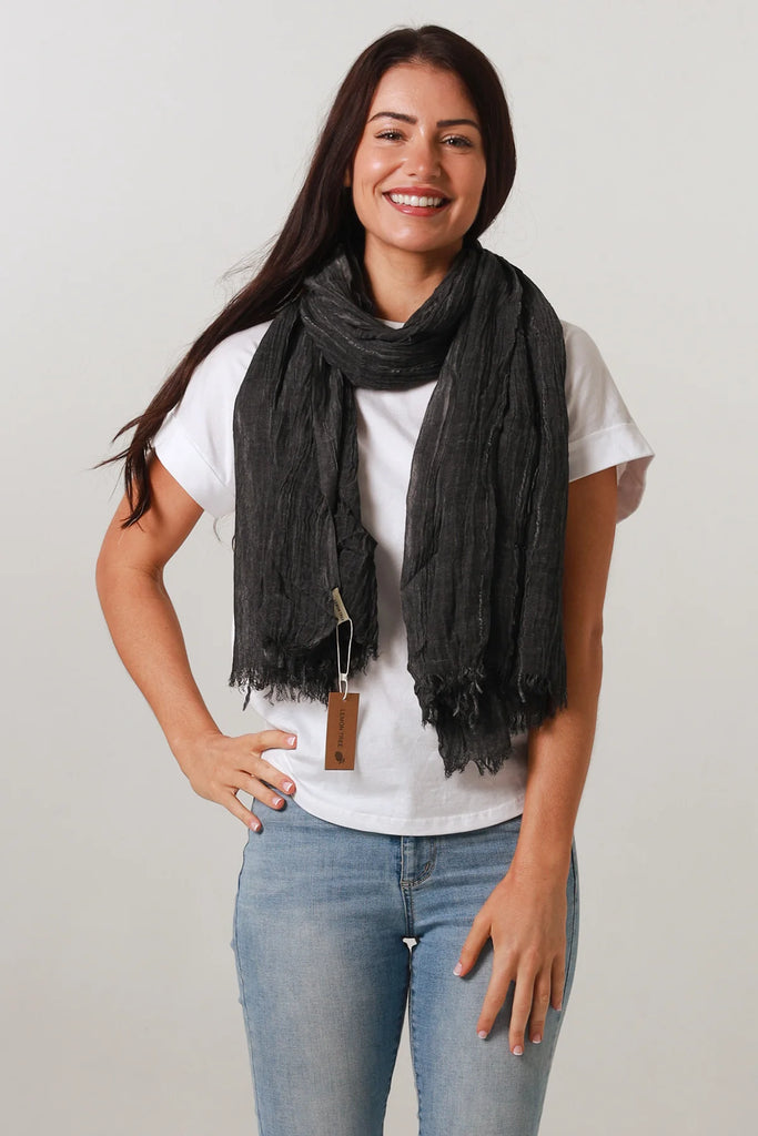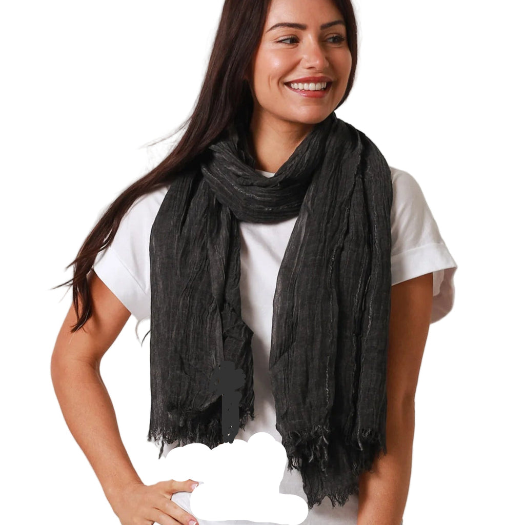 This crinkle cotton scarf in a black shade is a sophisticated addition to your wardrobe. Its textured fabric adds depth and interest to any outfit while providing lightweight comfort. Perfect for layering, this scarf delivers both style and versatility for year-round wear.