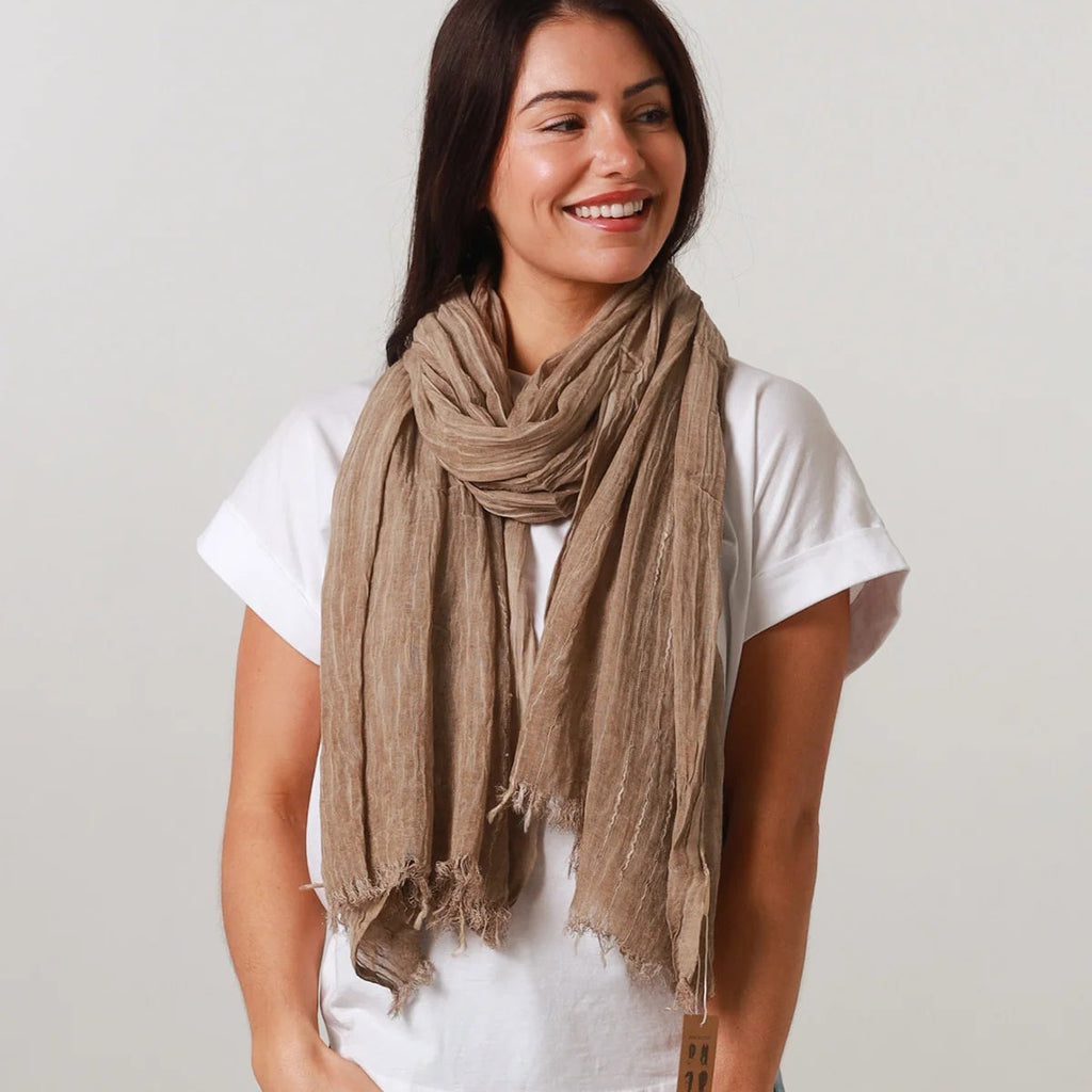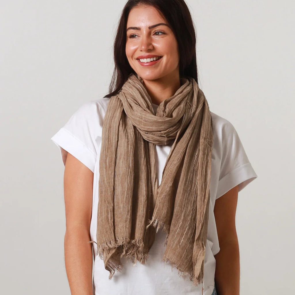 This crinkle cotton scarf in a warm caramel shade is a sophisticated addition to your wardrobe. Its textured fabric adds depth and interest to any outfit while providing lightweight comfort. Perfect for layering, this scarf delivers both style and versatility for year-round wear.
