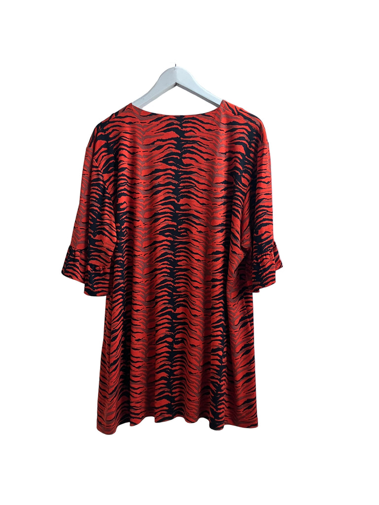 The Tangerine Tab Front Top features a stylish tab front design complemented by delicate frills on the sleeves, adding a touch of femininity and movement. Crafted with a bold, eye-catching print that spans approximately 3 inches, this tunic makes a confident statement in any wardrobe. Available in Medium, Large, and Extra Large sizes, it offers a comfortable and flattering fit for a range of body types. Perfect for both casual outings and more polished occasions, this versatile top combines fashion-forward details with everyday wearability.